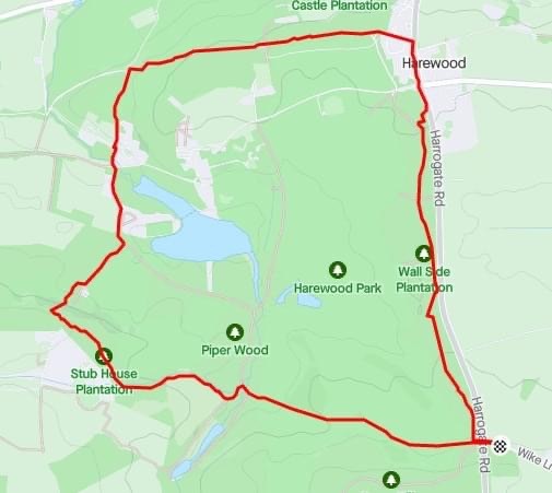The route involves an anti clockwise loop of the Harewood permissive paths starting at the black gates opposite Wike Lane. If you would like to run, please make sure that you are there in plenty of time. First runner to start at 6.45pm. Faster runners who are not going to start until the clock has been running for some time may arrive later, but must make sure that Sue Sunderland knows they have arrived so that she can mark them on the start sheet.