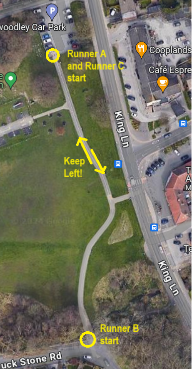 Jog from Leos to Alwoodley Green car park with a parent at the front with torch (no overtaking) and parent at back also with torch.