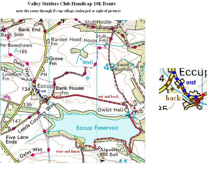 Start on the towpath at the bottom of Goodrick Lane at the end of the drain channel where we normally start and finish handicap races. Run along the towpath until you reach the gate and turn left onto the dam. Follow the road along the dam turning right then left past the waterworks then onto Eccup Moor Road. Follow Eccup Moor Road passing Bank House Farm on your right until you reach a fork in the road. Bear right onto Village Road. A little further on, ignore the turn to the left, continuing on Village Road. When this meets Eccup Lane, turn sharp left down Eccup Lane then almost immediately left down Blacksmith Lane (this used to be a road but is now more of a track). This takes you back onto Village Road, then after 40 metres there is a fork, bear right down another track, which then rejoins Eccup Moor Road a bit further down from where you ran up Village Road. Turn left and follow the route back along Eccup Moor Road and the towpath until you reach the start again.